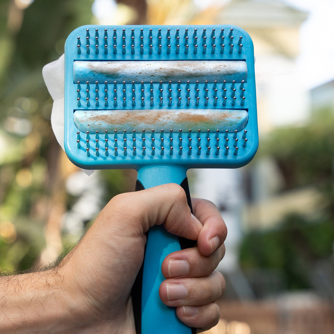 The gentle brush with a built-in wet wipe system removes dirt, ensuring a healthier coat for your pet.